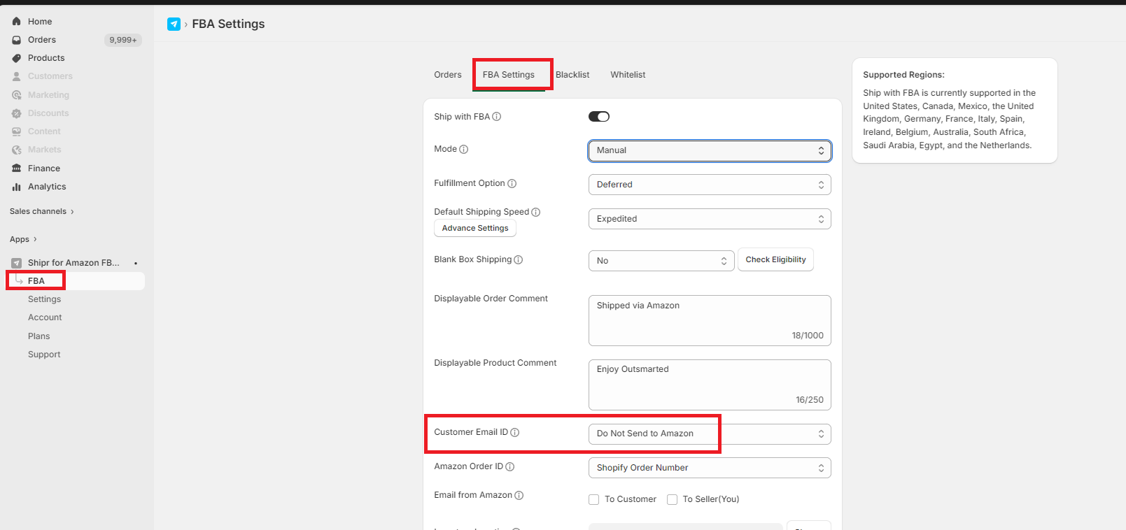 When fulfilling orders through Fulfillment by Amazon (FBA), the Customer Email ID field allows you to control whether the customer’s email address is sent to Amazon along with the order details.