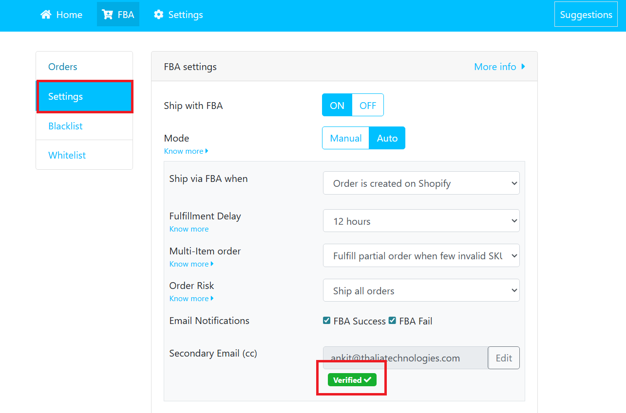 Go to your Shipr dashboard > Navigate to FBA > Settings > Secondary Email (cc) > Enter your desired "email address" in the input box > Click Verify Email.