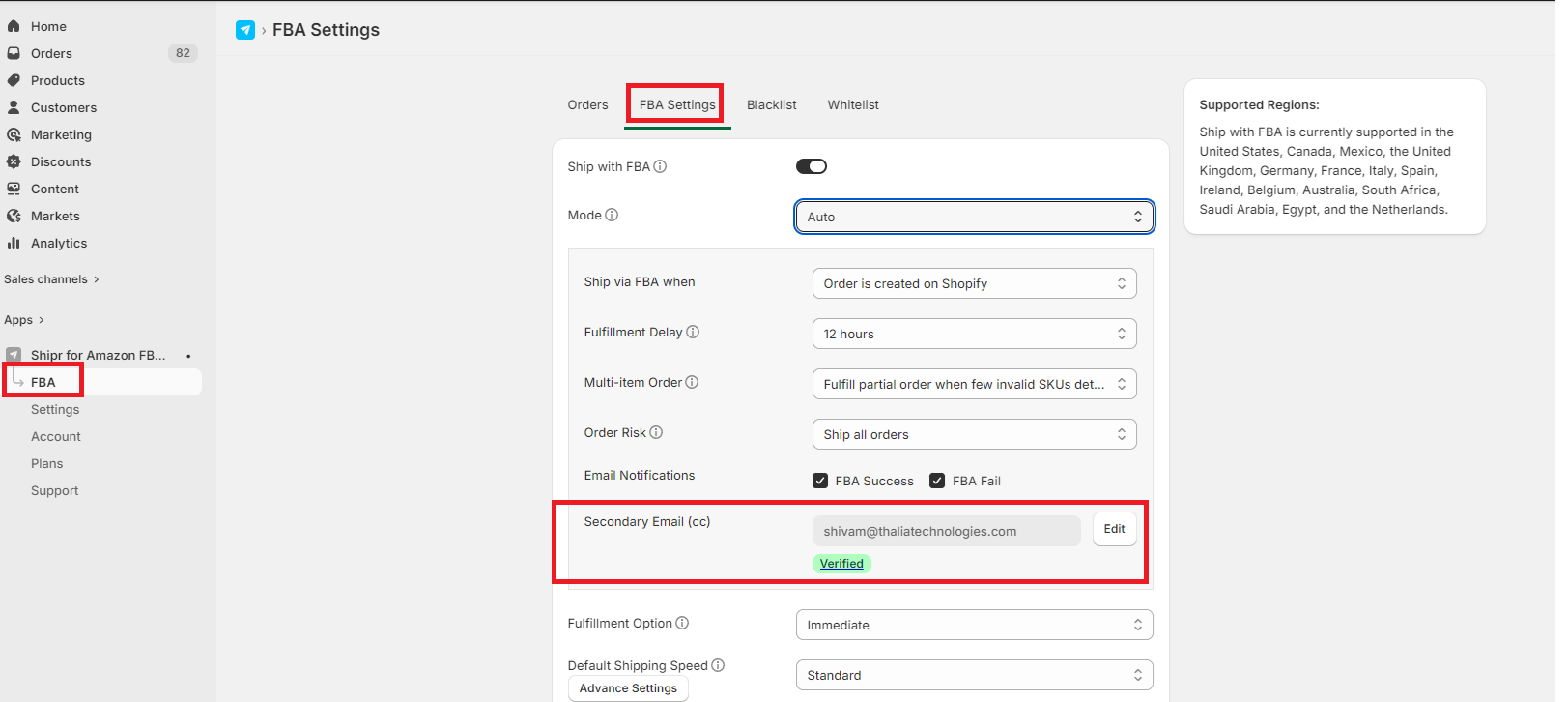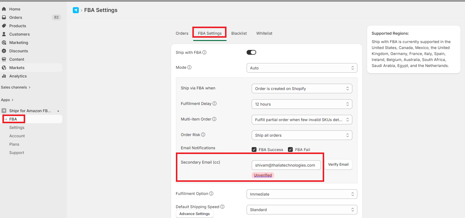 Go to your Shipr dashboard > Navigate to FBA > FBA Settings > Secondary Email (cc) > Enter your desired "email address" in the input box > Click Verify Email.